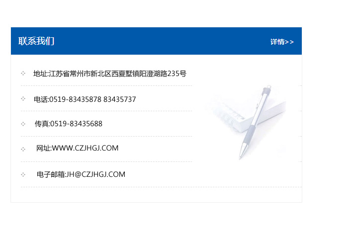 地址:常州市新北區友邦商務大廈1幢16、17層  電話:0519-85101652  傳真:0519-85112595  郵編:213022  網址:www.cz-jiayue_cn.sh-zhengting.com  郵箱:xiajifengaa@163.com